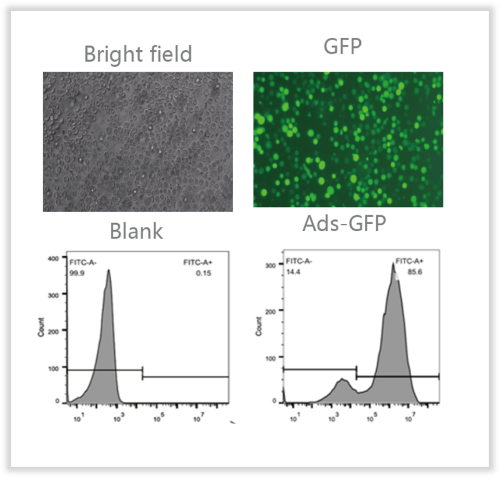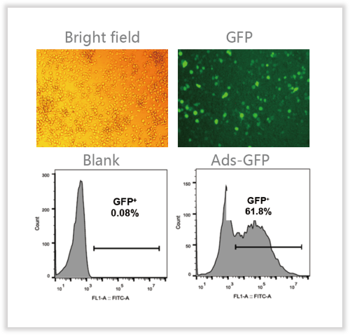 The Suspended cell specific adenovirus(Ads)developed has been modified for the cell membrane characteristics of suspension cells, and the virus infection system has also been optimized accordingly, which greatly improves the infection ability for suspension cells. It has no effect on the infection ability of adherent cells and can be used universally. The infection efficiency is close to 100% for many suspension cell lines such as Jurkat, K562, etc., and can reach more than 60% for primary cells of blood origin, such as CD4+ T cells.